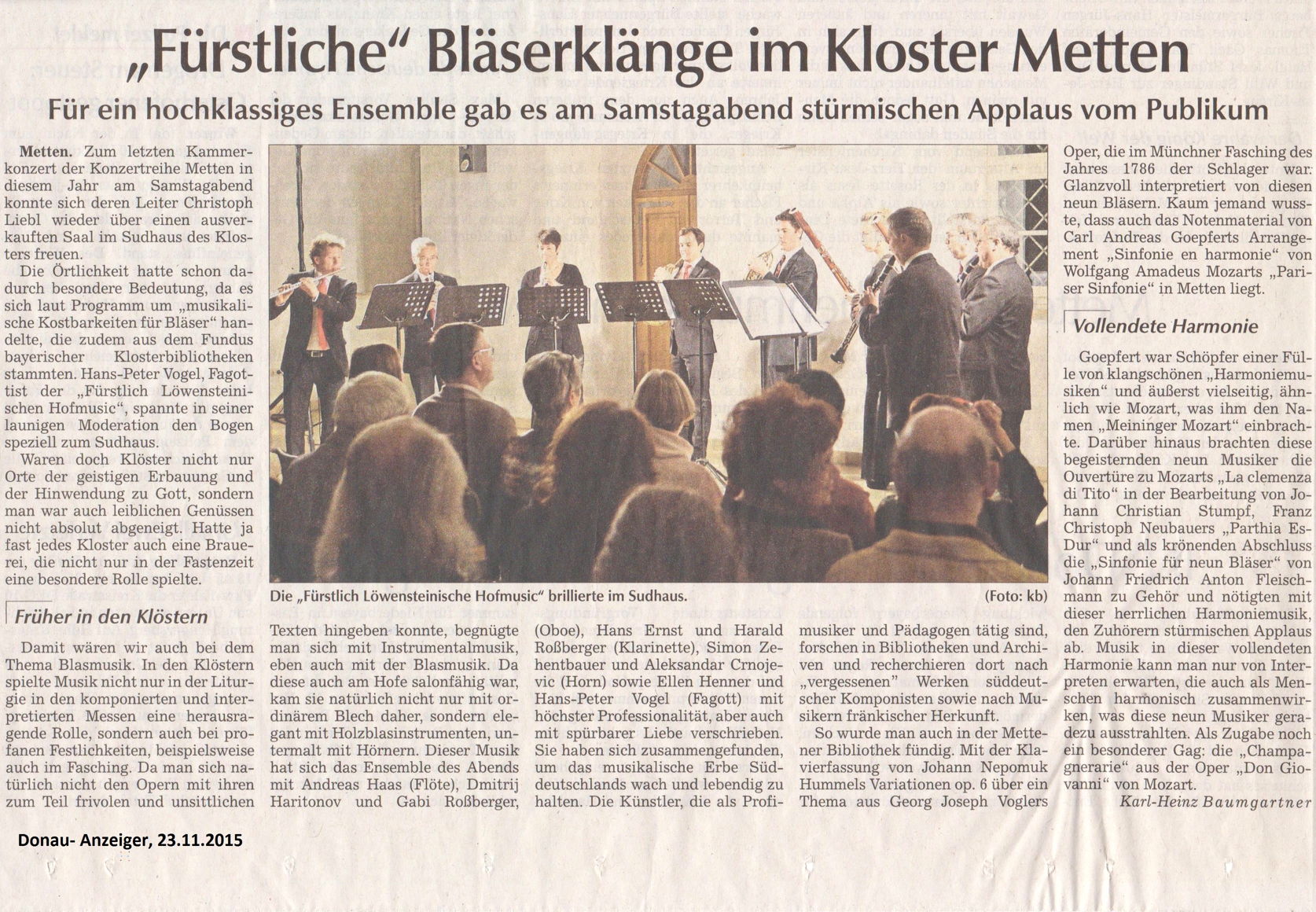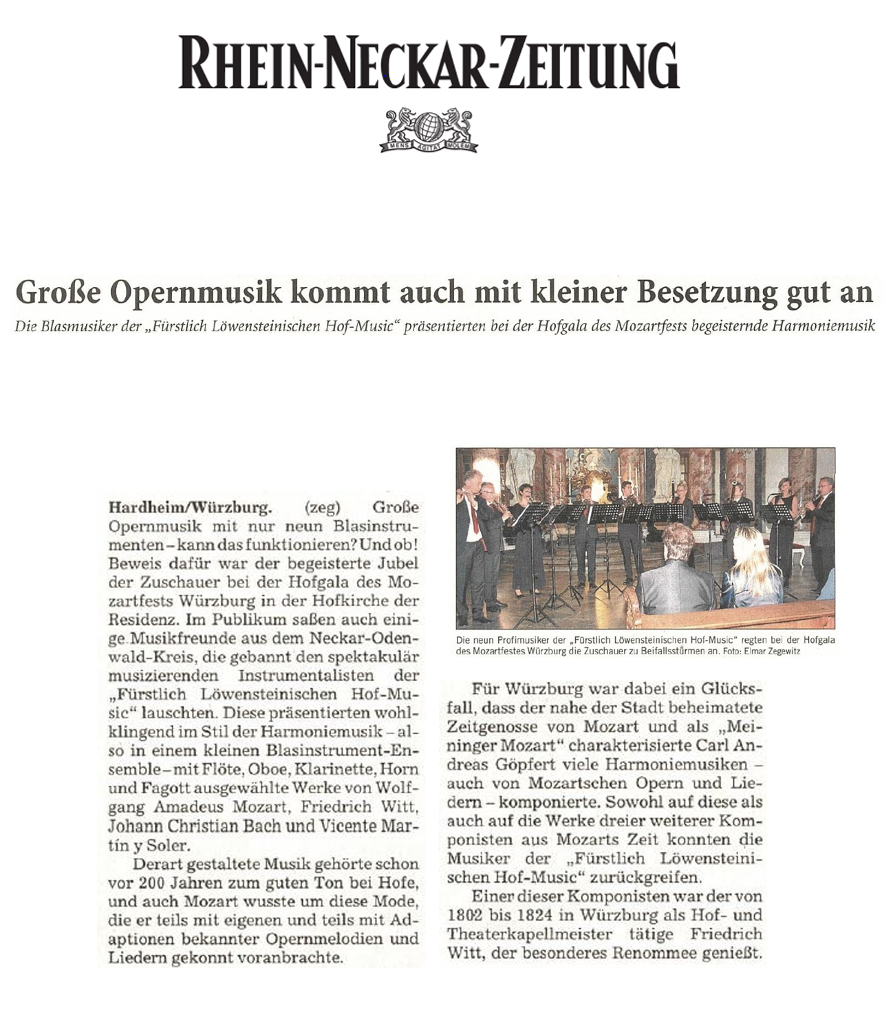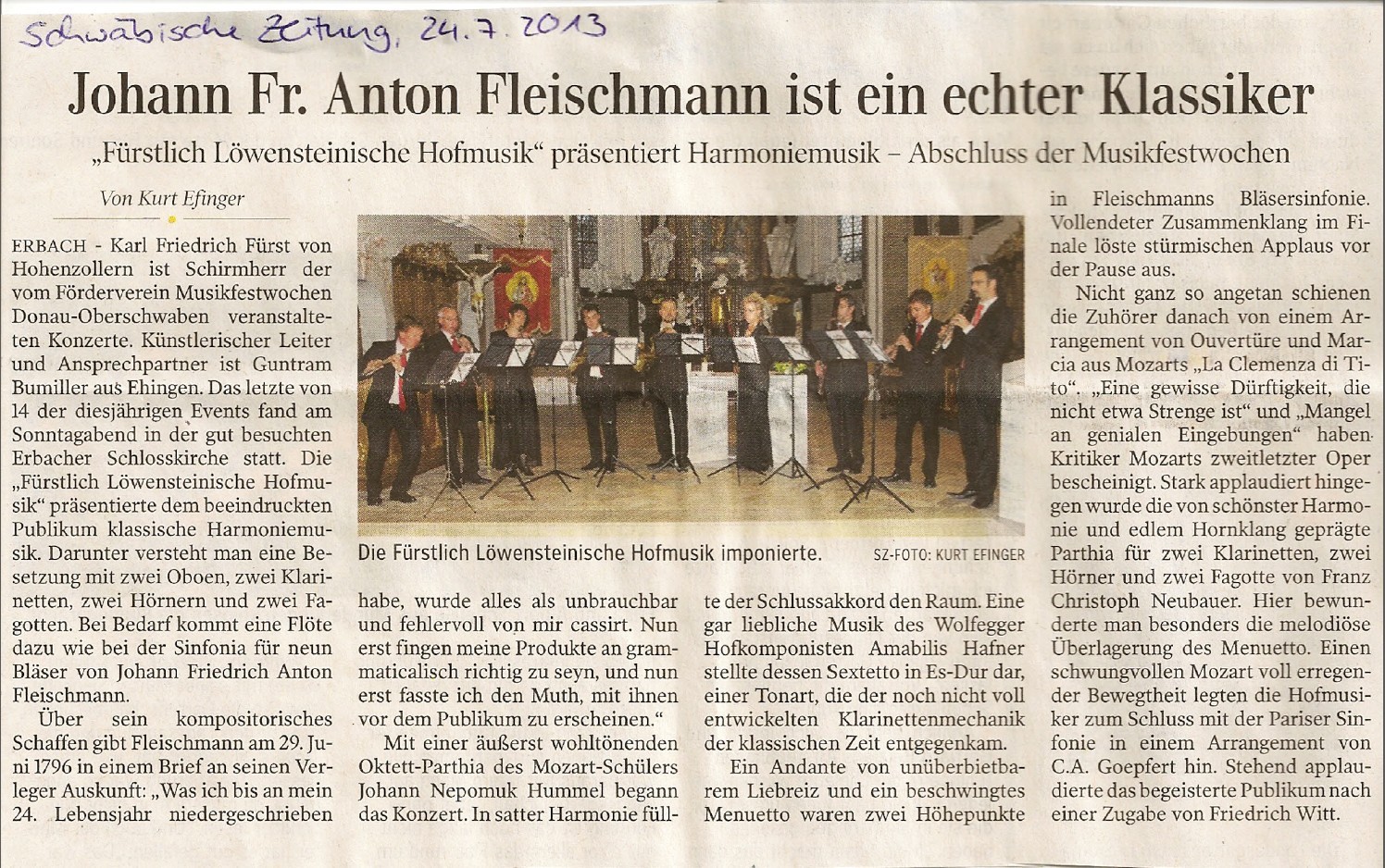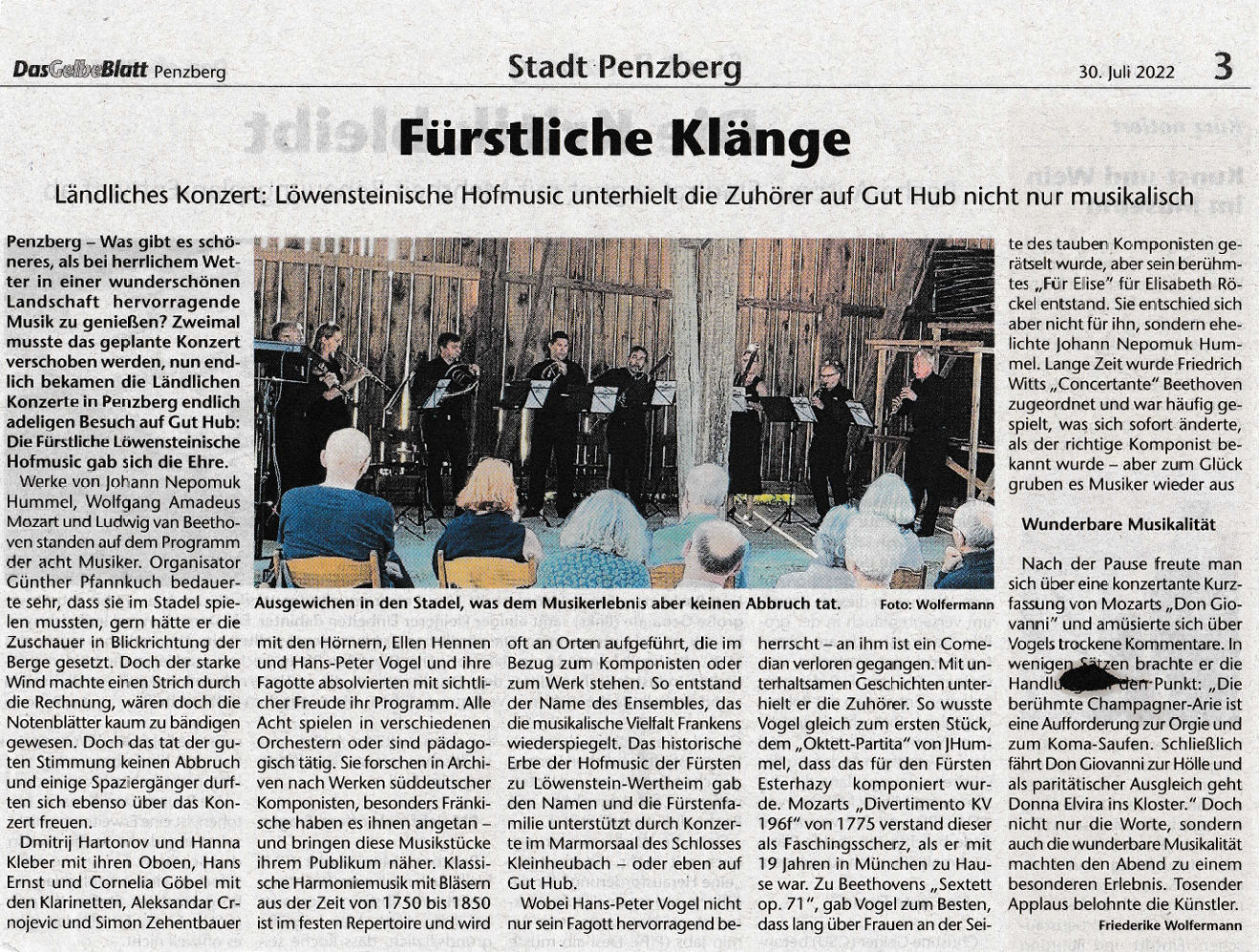 Mit Musik, wie sie an den süddeutschen Fürstenhöfen im 18. Jahrhundert gepflegt wurde, erfreute das Ensemble, wobei seine spürbare Spielfreude und die launige Moderation des leitenden Fagottisten Hans-Peter Vogel das Vergnügen noch steigerte."