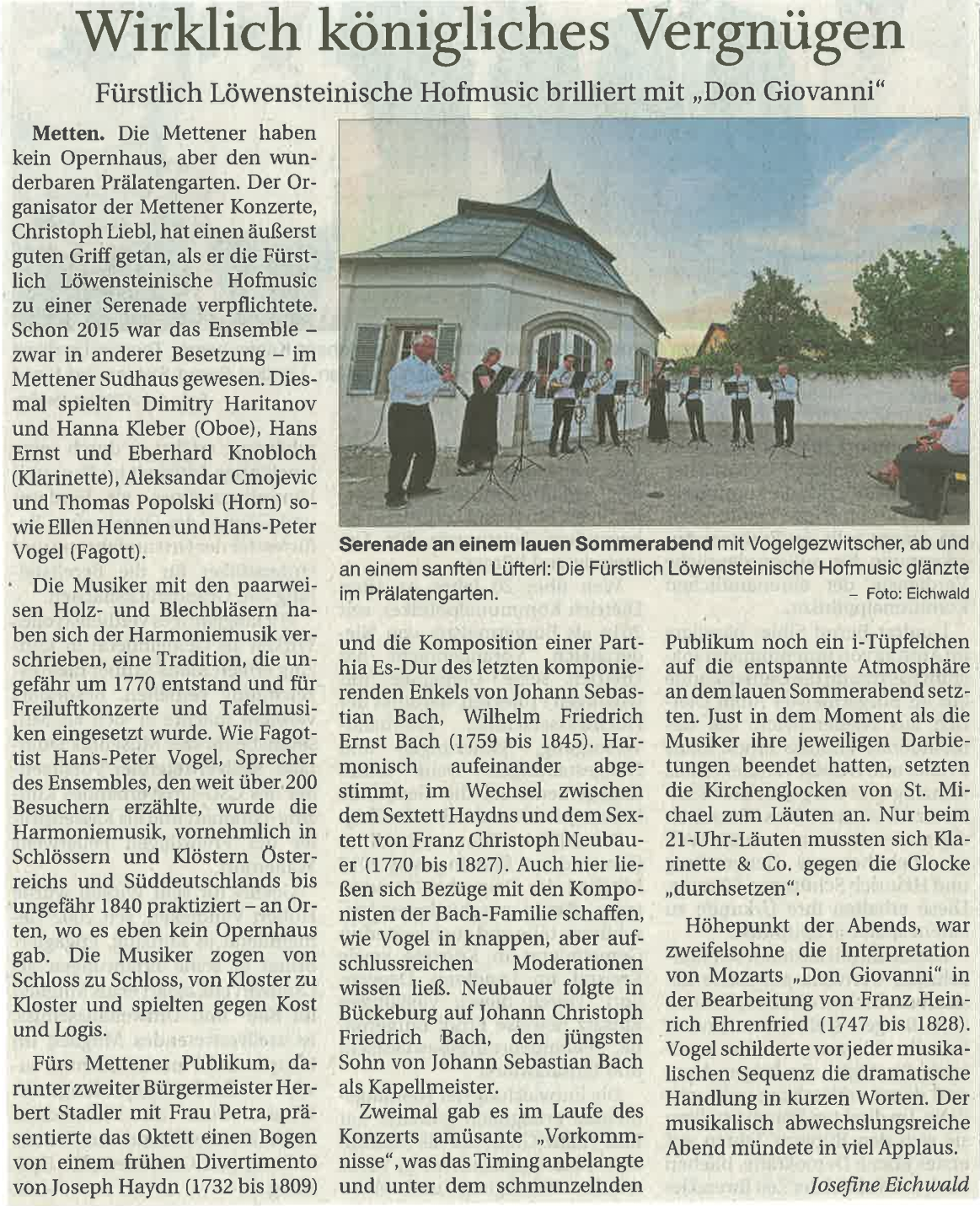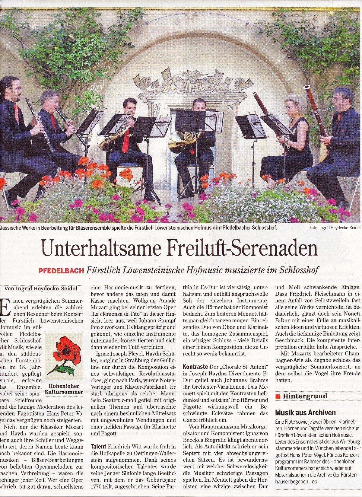 "Einen vergnüglichen Sommerabend erlebten die zahlreichen Besucher beim Konzert der Fürstlich Löwensteinischen Hofmusic im stilvollen Pfedelbacher Schlosshof.