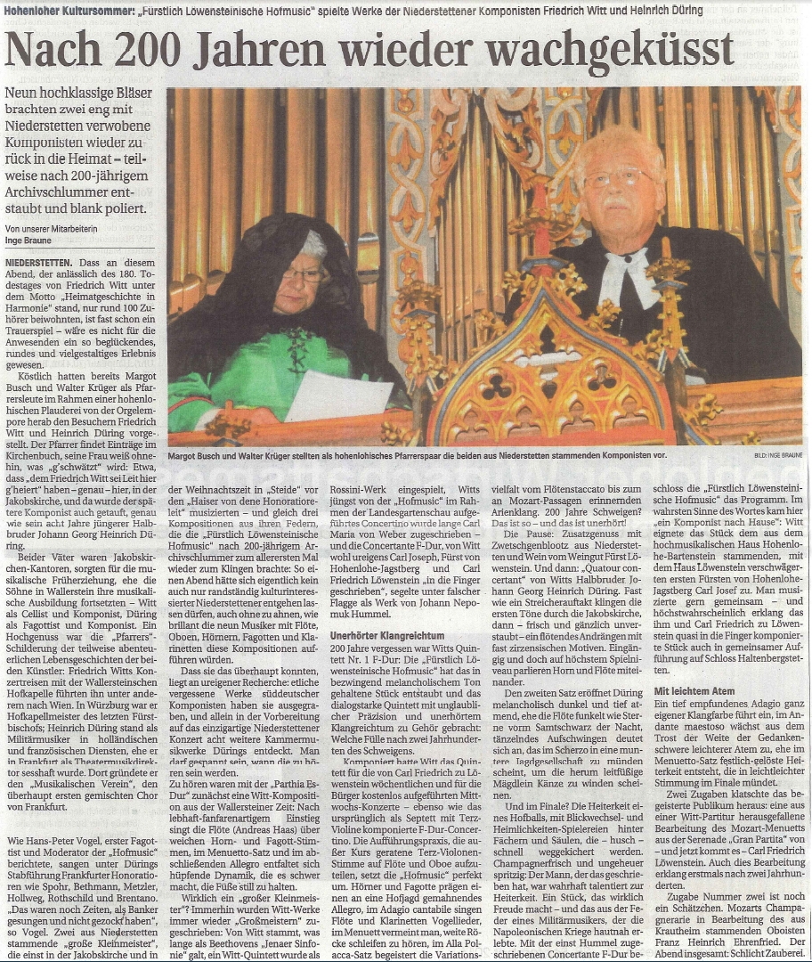 "Neun hochklassige Bläser brachten zwei eng mit Niederstetten verwobene Komponisten wieder zurück in die Heimat - teilweise nach 200-jährigem Archivschlummer entstaubt und blank poliert."
